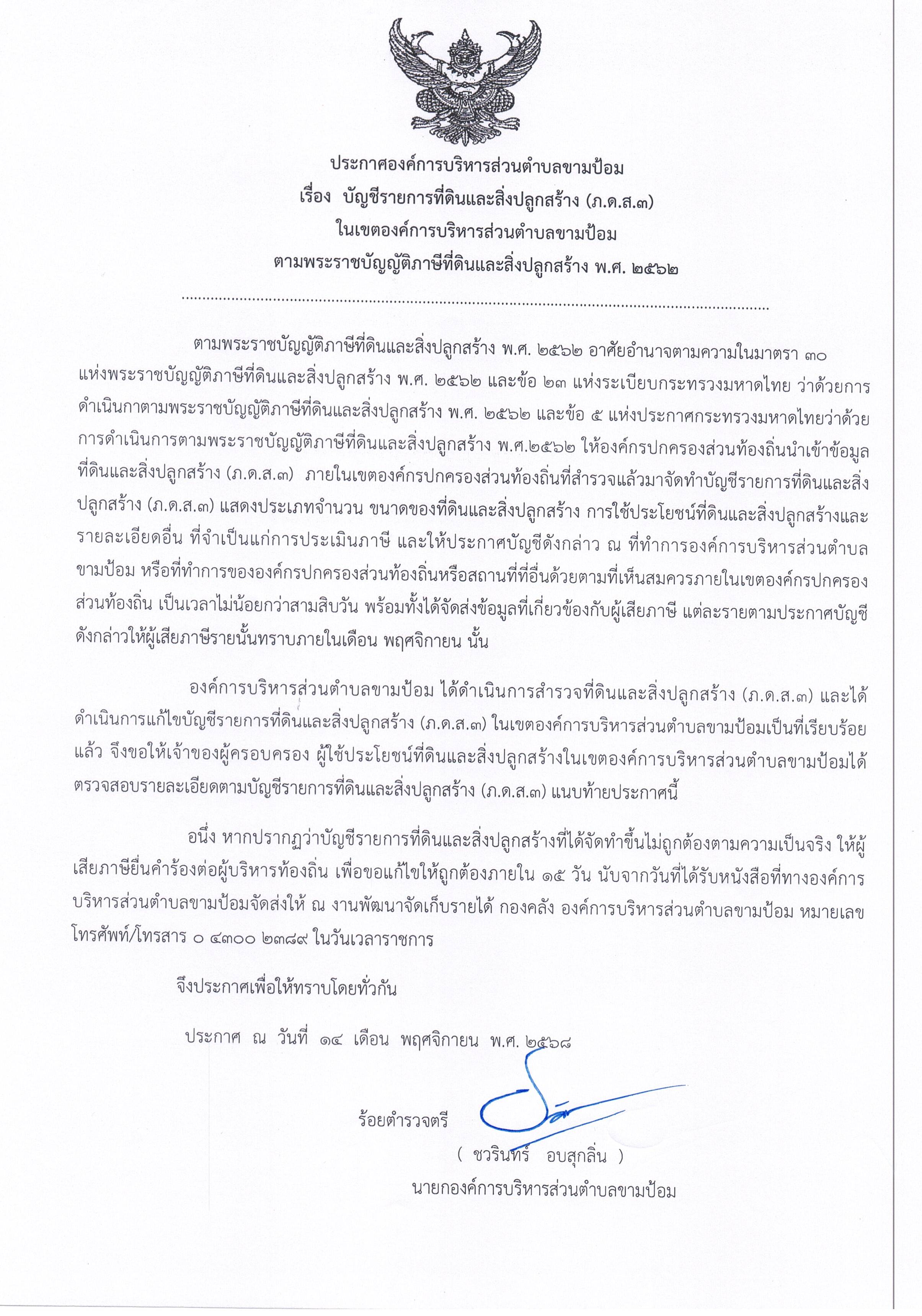 ประกาศองค์การบริหารส่วนตำบลขามป้อม เรื่อง บัญชีรายการที่ดินและสิ่งปลูกสร้าง (ภ.ด.ส.๓) ในเขตองค์การบริหารส่วนตำบลขามป้อม ตามพระราชบัญญัติภาษีที่ดินและสิ่งปลูกสร้าง พ.ศ. ๒๕๖๖๒ลงข่าว: 18/11/2568